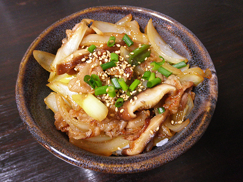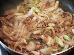 6. 玉ねぎが透明になったら、ご飯にかけて、スタミナ満点!源たれスタ丼の完成。